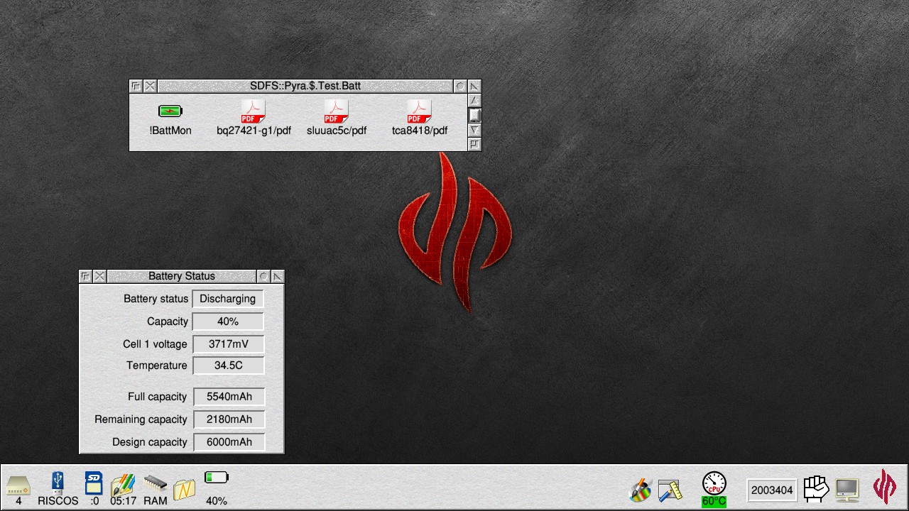 Aktueller Stand der RISC OS Umsetzung auf der Pyra entspricht in etwa dem für das OMAP5 EVM und das IGEPv5. Der Treiber für die Pyratastatur ist noch etwas fehlerhaft und zieht USB mit runter und auf dem Pyradisplay ist noch nichts zu sehen. HDMI funktioniert.