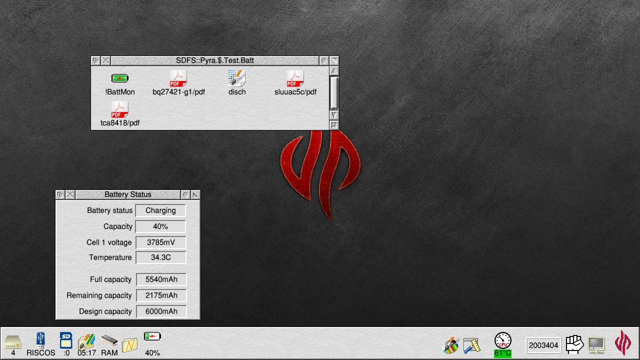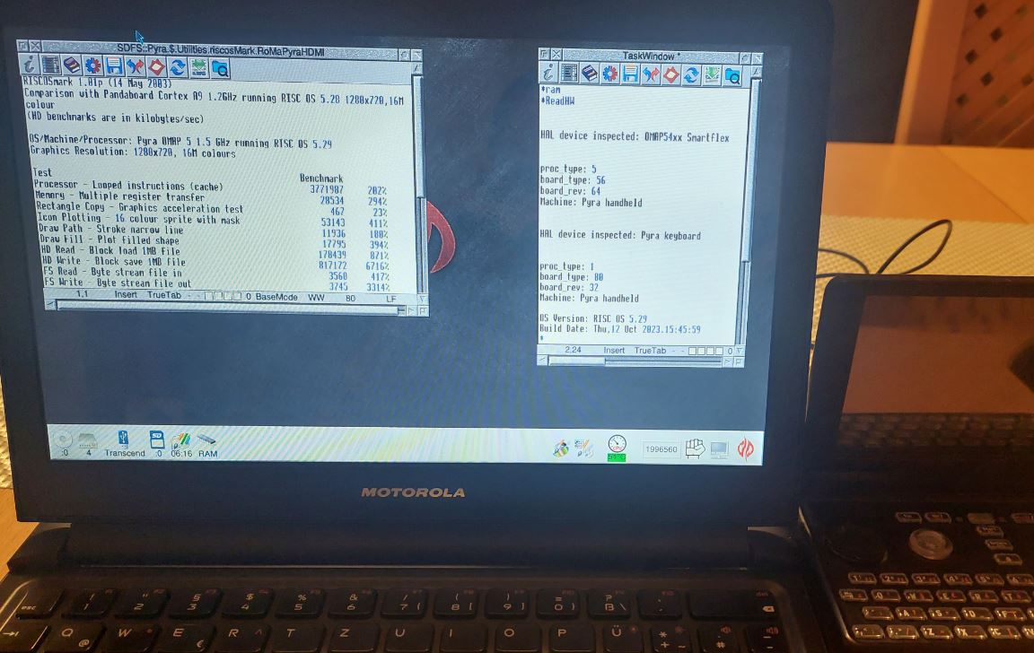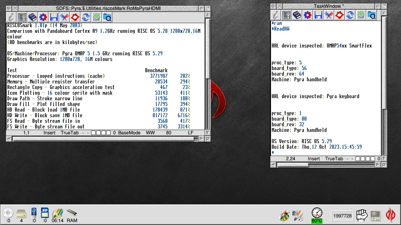 Aktueller Stand der RISC OS Umsetzung auf der Pyra entspricht in etwa dem für das OMAP5 EVM und das IGEPv5. Der Treiber für die Pyratastatur ist noch etwas fehlerhaft und zieht USB mit runter und auf dem Pyradisplay ist noch nichts zu sehen. HDMI funktioniert.