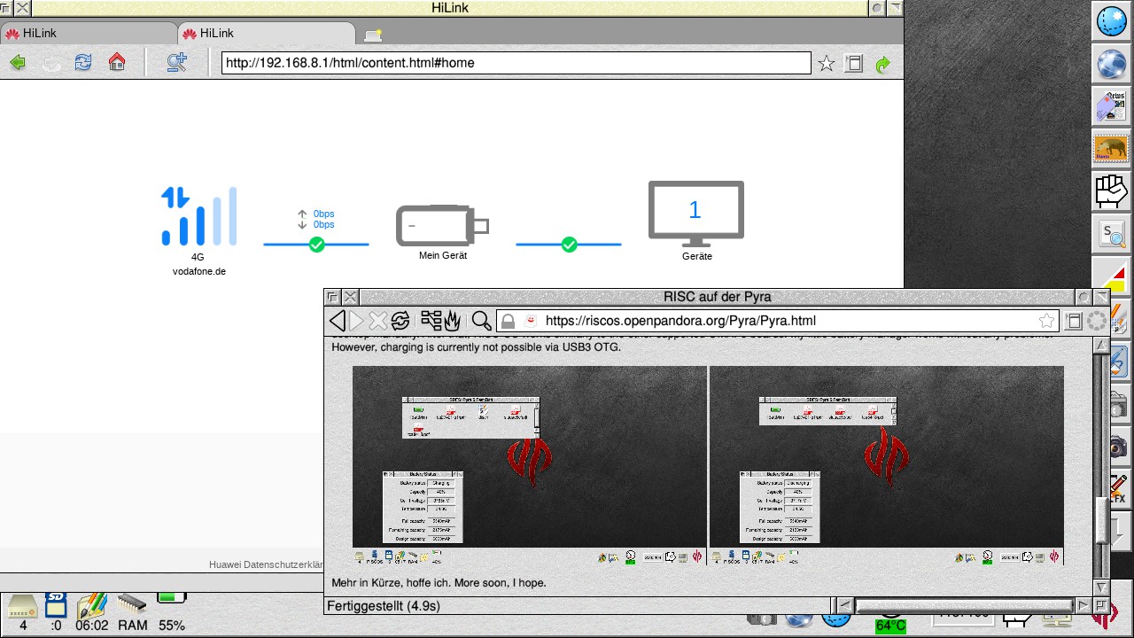 LTE funktioniert bisher "nur" über einen externen Surfstick (ich habe einen HUAWEI E3372). Ob das interne Modem später unter RISC OS funktionieren kann, wissen wir noch nicht. Aktuell wird auch das nicht mit Spannung versorgt.